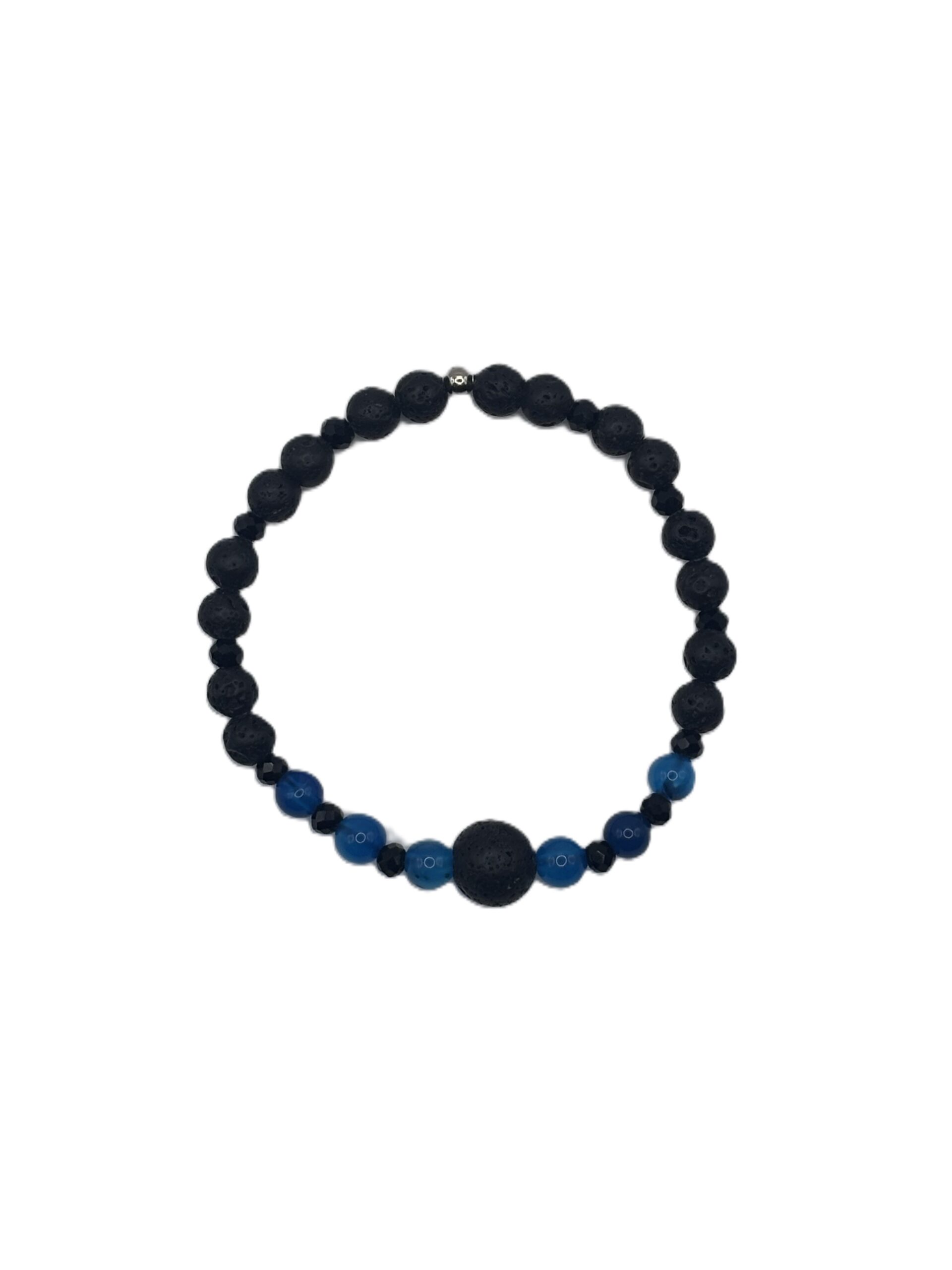 Lasciati sedurre dal contrasto magnetico di questo bracciale esclusivo, un gioiello che esplora le sfumature della terra e del cielo in un design dinamico e moderno. La struttura, realizzata con pietre da 6mm, alterna la misteriosa ossidiana nera alla texture ancestrale della lava, creando una base profonda che esalta le vibranti tonalità dell’agata blu. Al centro del design svetta una maestosa perla in lava da 10mm, un dettaglio materico di grande impatto che conferisce al gioiello una personalità decisa e un carattere scultoreo. L’incontro tra il nero assoluto delle pietre vulcaniche e le venature cristalline dell’agata blu trasforma questo accessorio in un vero talismano di stile, perfetto per chi cerca un dettaglio che sappia comunicare forza e serenità allo stesso tempo. La combinazione di diverse dimensioni e consistenze offre un’esperienza tattile unica e una vestibilità impeccabile, rendendo il bracciale ideale per completare ogni look con un tocco di eleganza artigianale ricercata. Scegliere questo pezzo significa indossare la qualità di materiali naturali selezionati, uniti in un design distintivo pensato per chi non vuole passare inosservato e ama i gioielli che raccontano una storia di energia e bellezza.