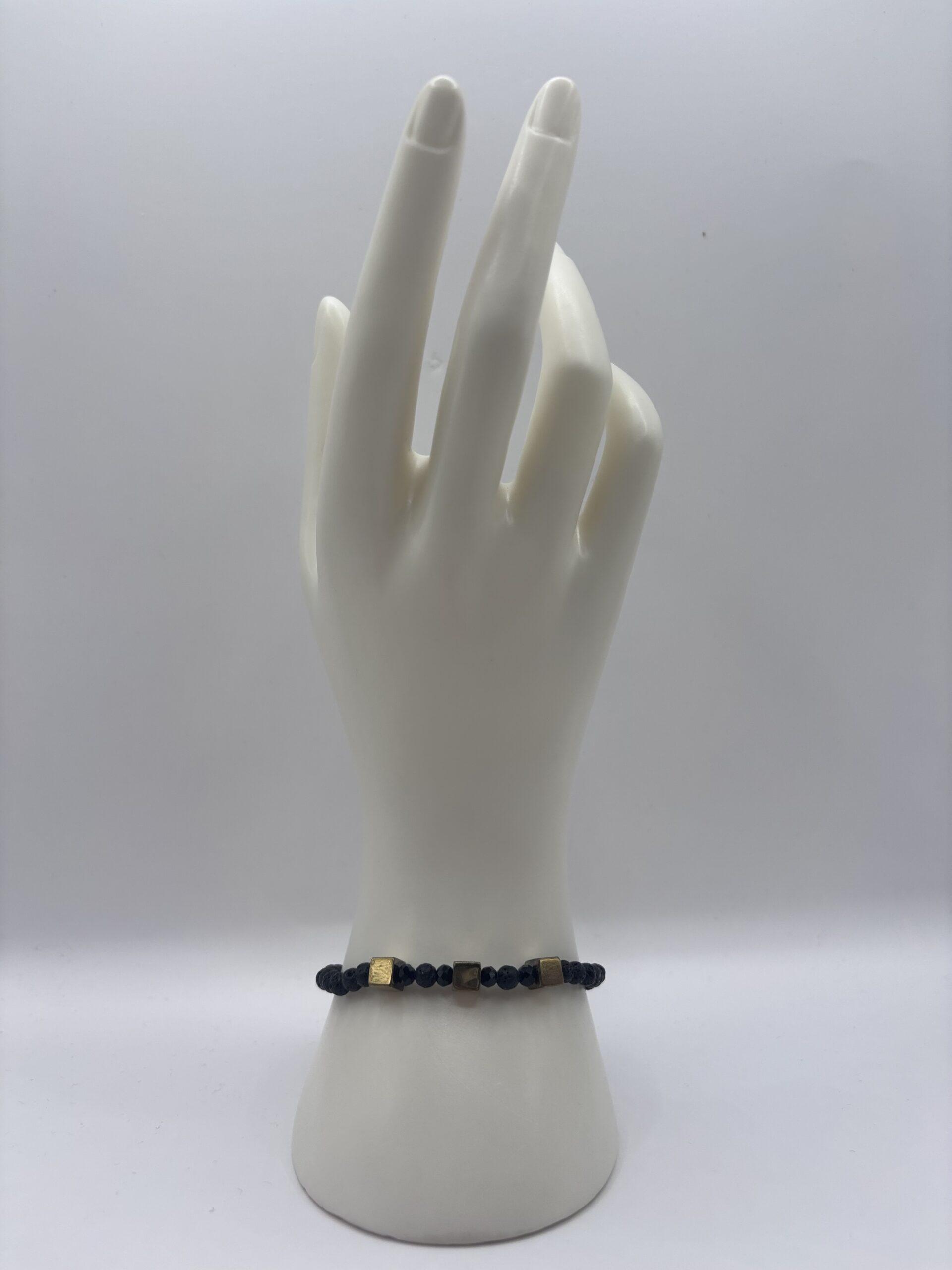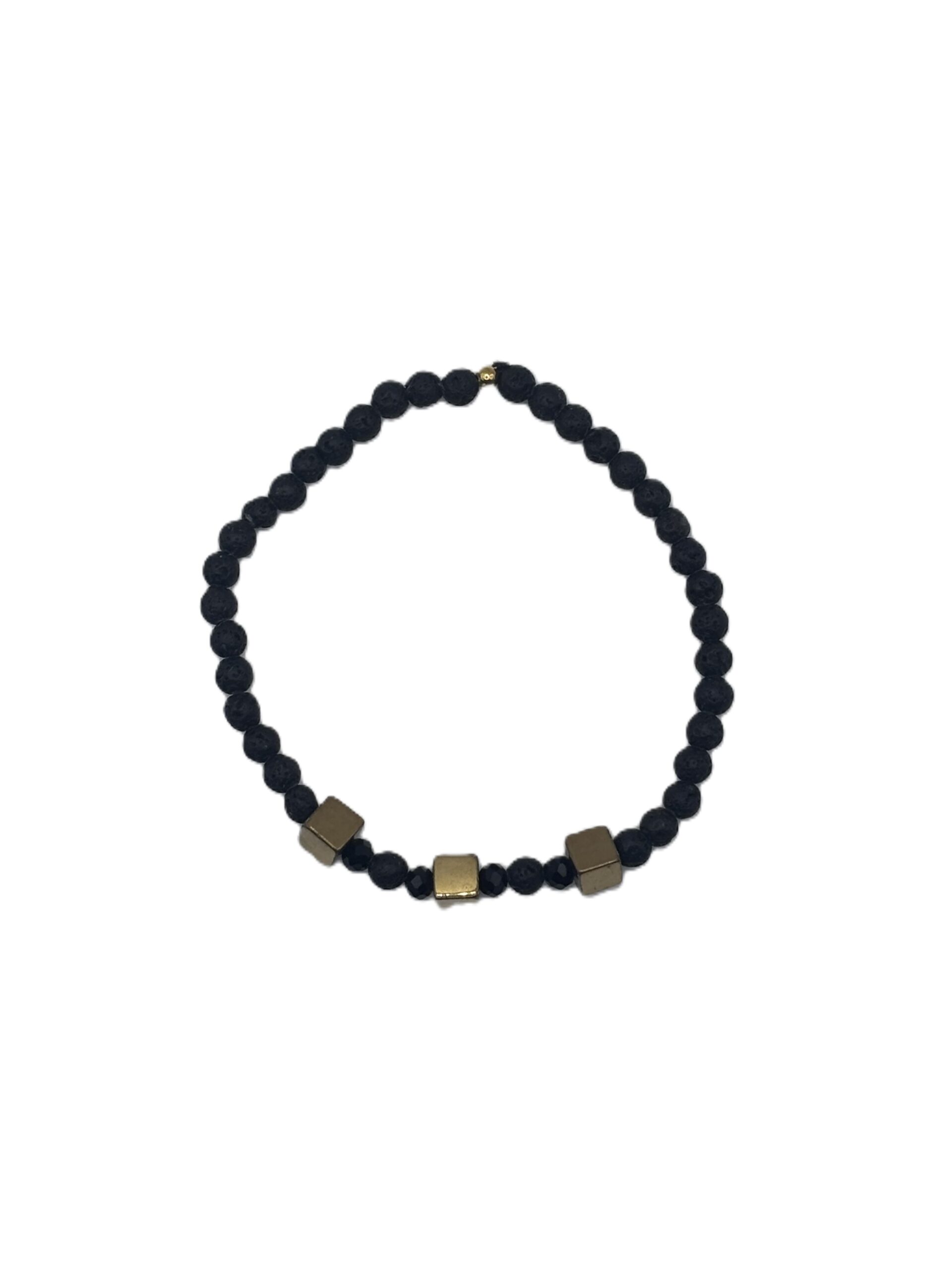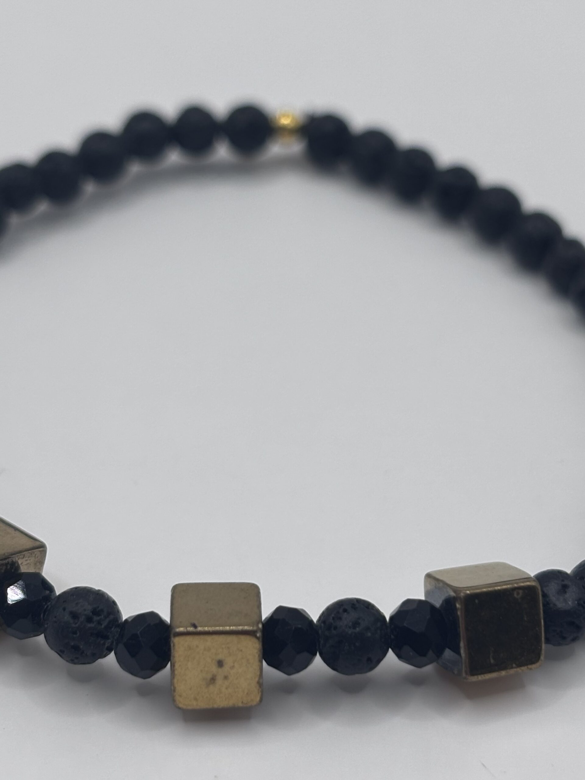 Bracciale con Pietre di Lava da 4mm, Ossidiana e Cubi in Ematite Dorata